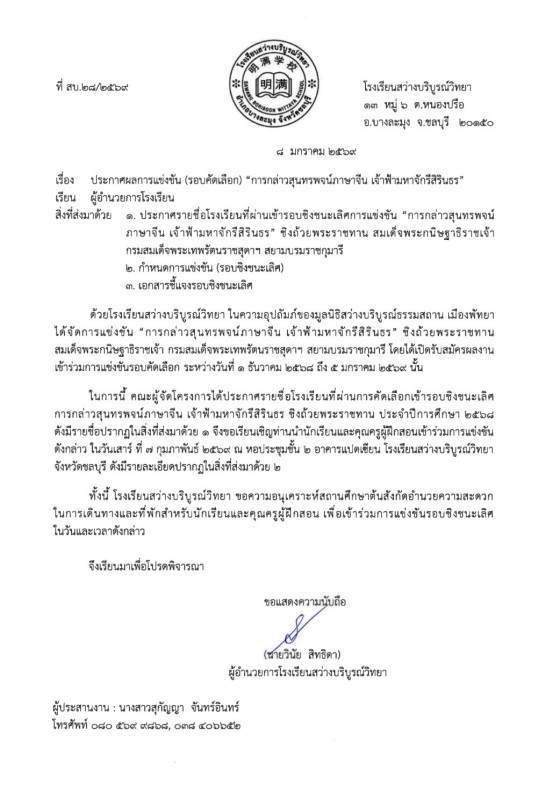 ขอแสดงความยินดีกับ เด็กหญิงภณิตา ระจิตดำรงค์ นักเรียนชั้นประถมศึกษาปีที่ ๖/๓ โรงเรียนบุญญวิทยาคาร ที่ผ่านการคัดเลือกเข้าสู่ รอบชิงชนะเลิศการกล่าวสุนทรพจน์ภาษาจีน “เจ้าฟ้ามหาจักรีสิรินธร” ชิงถ้วยพระราชทาน สมเด็จพระกนิษฐาธิราชเจ้า กรมสมเด็จพระเทพรัตนราชสุดา เจ้าฟ้ามหาจักรีสิรินธรฯ ประจำปีการศึกษา ๒๕๖๘