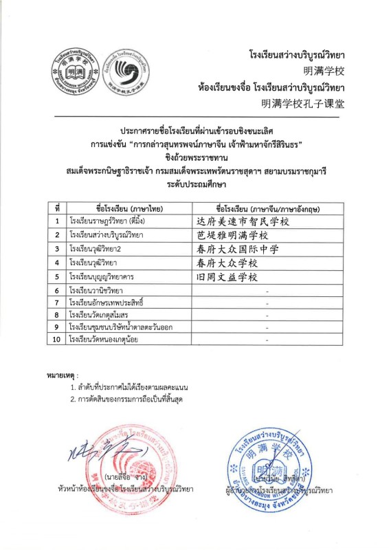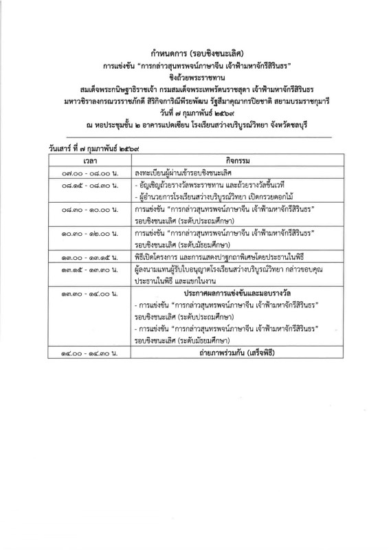 兹定于 二〇二六年二月七日于春武里府明满学校八仙楼二楼礼堂举行决赛。